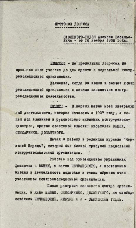 Протокол допиту Олекси Савицького-Ґедзя від 16 листопада 1936 р. [Електронний ресурс] // Електронний архів українського визвольного руху. – Режим доступу:https://avr.org.ua/viewDoc/29048. – Дата звернення: 01.11.2023.