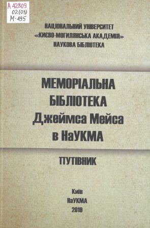 - Меморіальна бібліотека Джеймса Мейса в НаУКМА : путів. / Нац. ун-т “Києво-Могилян. акад.”. Наук. б-ка ; уклад. О. Л. Жолудь [та ін.]. – Київ : НаУКМА, 2019. – 507 с. : фот. Шифр: А42809/02(03)/М495