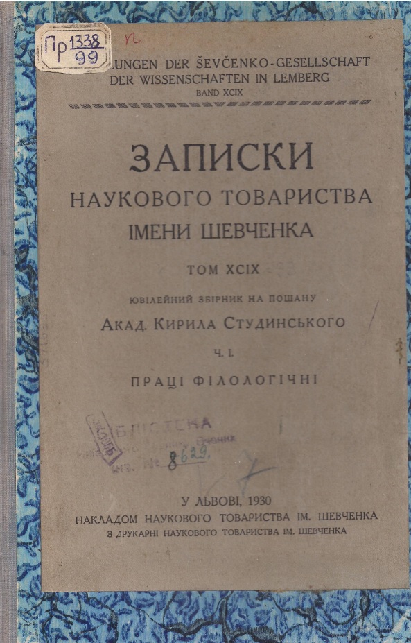 Ювілейний збірник на пошану Акад. Кирила Студинського. Ч. І. Філологічні праці / Записки Наукового товариства імені Шевченка . Т.99. – У Львові, 1930. – 388 с.