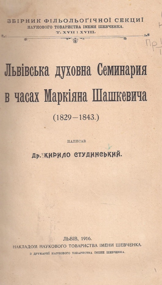 Львівська духовна семінарія в часах Маркіяна Шашкевича ( 1829 - 1843 ) / написав Др. Кирило Студинський. – Львів, 1916. – 416 с. ( Збірник філологічної секції Наукового товариства ім. Шевченка. – Т. XVII і XVIII ).