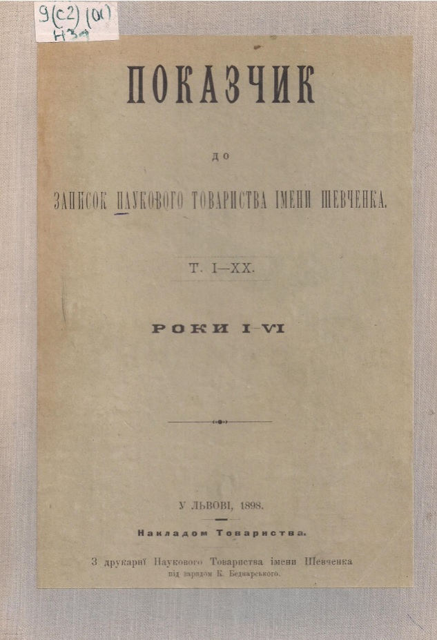 Наукове товариство імені Т. Г. Шевченка. Покажчик до записок наукового товариства імені Шевченка . Т . I–XX. Роки I–VI. - Львів : Друк. Наук. т-ва ім. Шевченка, 1898. – 66 с.