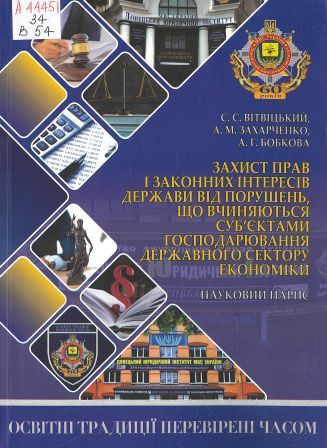 Вітвіцький С. С. Захист прав і законних інтересів держави від порушень, що вчиняються суб’єктами господарювання державного сектору економіки: науковий нарис / С. С. Вітвіцький , А. М. Захарченко, А. Г. Бобкова ; М-во внутрішніх справ України. Донец. юрид. ін-т, Наук.‑дослід. лабараторія публ. безпеки громад. – Київ : Дакор, 2021. – 103 с. Шифр: А44451/34/В54