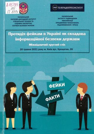Протидія фейкам в Україні як складова інформаційної безпеки держави : міжнар. кругл. стіл, 20 трав. 2021 р. / СБУ. Укр. наук.-дослід. ін-т спец. техніки та судових експертиз, Укр. ін-т підвищення кваліфікації працівників телебачення, радіомовлення і преси ; ред. кол. А. В. Свінцицький [та ін.]. – Київ : ІСТЕ СБУ, 2021. – 125 с. : схем., портр. Шифр : А45793/35/П833/КУ