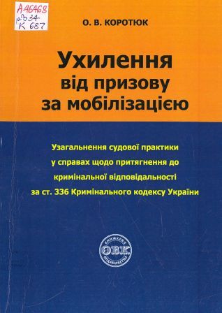 Коротюк О. В. Ухилення від призову за мобілізацію : узагальнення судової практики у справах щодо притягнення до кримінальної відповідальності за ст. 336 Кримінального кодексу України : практ. посіб. / О. В. Коротюк. – Київ : ОВК, 2023. – 131 с. Шифр: А46468/34/К687/ЧЗ.