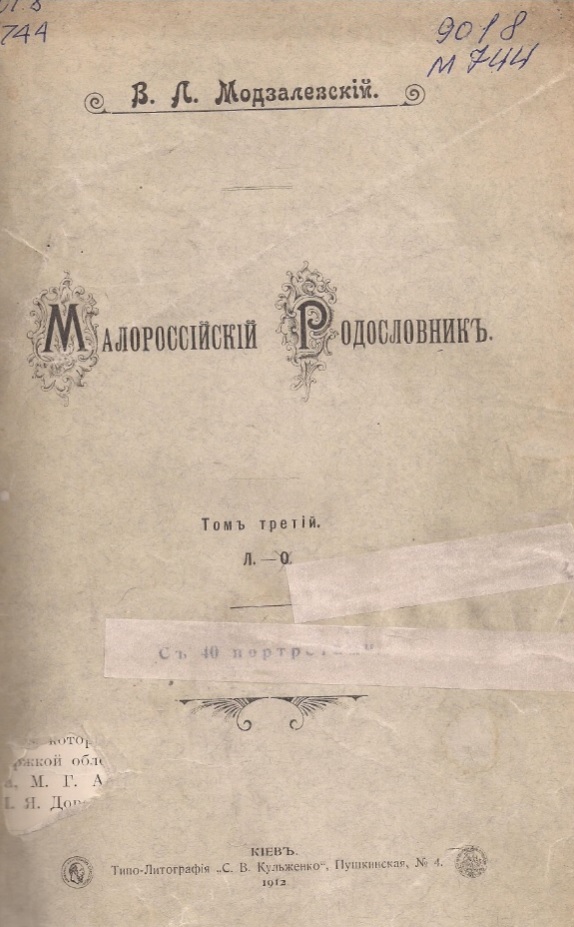 Модзалевский В. Л. Малороссийский родословник. Т. 3 / В. Л. Модзалевский. – Киев : Тип. Кульженко, 1912. – 235 с. : 10 л. портр.
