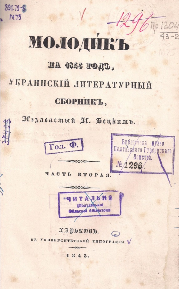 Шевченко Т. Г. Н. Маркевичу / Т. Г. Шевченко // Молодик на 1843 год, украинскій литературный сборник, издаваемый И.Бецким. Ч. 2. – Харьков : в университетской типографіи, 1843. – С.108 - 109.