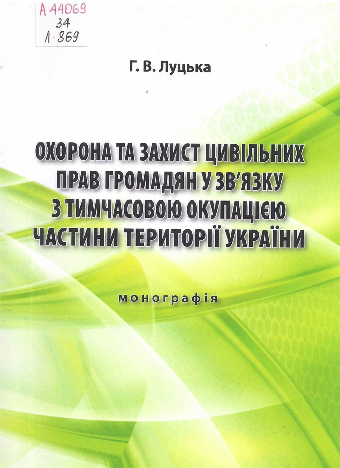 Луцька Г. В. Охорона та захист цивільних прав громадян у зв’язку з тимчасовою окупацією частини території України : монографія / Г. В. Луцька ; Ун-т Короля Данила. – Київ : Вид-во Людмила, 2020. – 203 с.