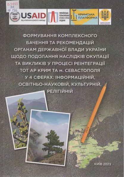 23. Формування комплексного бачення та рекомендацій органам державної влади України щодо подолання наслідків окупації та викликів у процесі реінтеграції ТОТ АР Крим та м. Севастополя у 4 сферах: інформаційній, освітньо-науковій, культурній, релігійній / Українська Гельсінська спілка з прав людини, Кримський центр ділового та культурного співробітництва «Український дім». – Київ : АртЕк, 2023. – 152 с. Шифр: В5495/34/Ф796.
