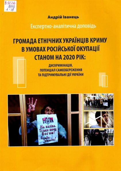 13. Іванець А. Громада етнічних українців Криму в умовах російської окупації станом на 2020 рік: дискримінація, потенціал самозбереження та підтримувальні дії України : експертно-аналіт. доповідь / А. В. Іванець ; Крайова Рада Українців Криму, Н.-д. ін-т українознавства, Майдан закордонних справ. – Київ : Українська культура, 2021. – 60 с. : фот. Шифр: В5026/9(с2)/І-19.