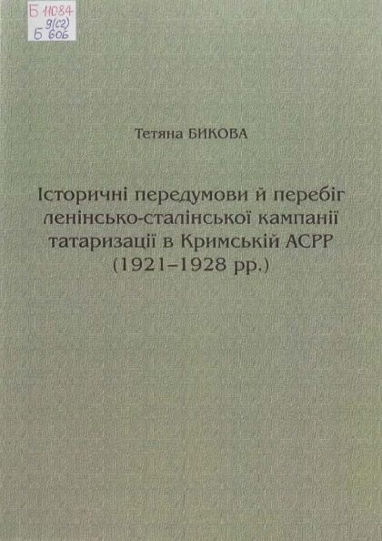 5. Бикова Т. Історичні передумови й перебіг ленінсько-сталінської кампанії татаризації в Кримській АСРР (1921–1928 рр.) : [монографія] / Тетяна Бикова ; НАН України. Ін-т історії України. – Київ, 2020. – 577 с. : табл. Шифр: Б11084/9(с2)/Б606.
