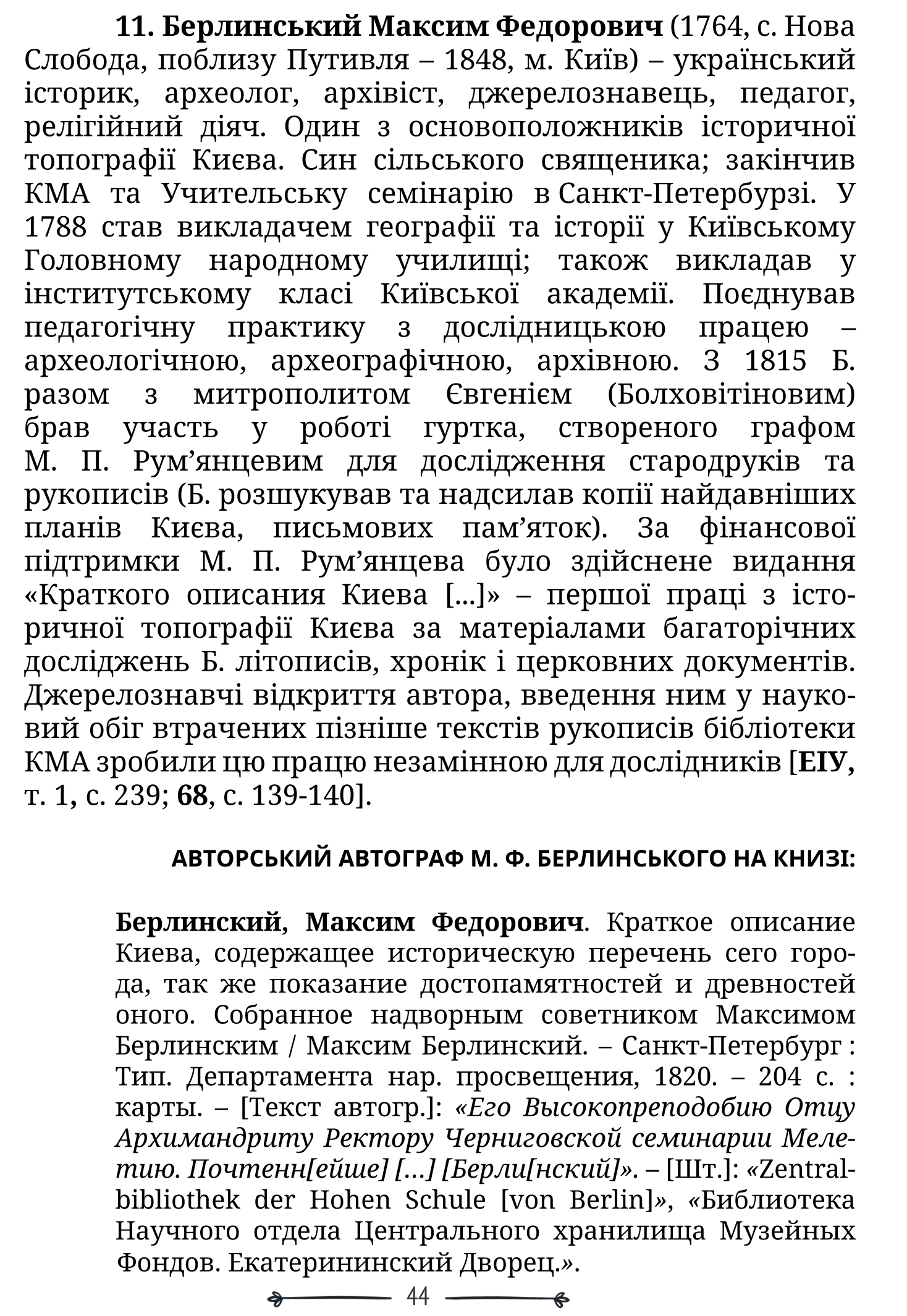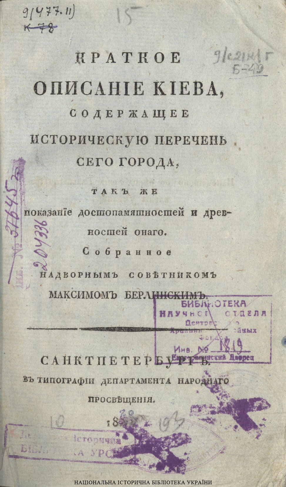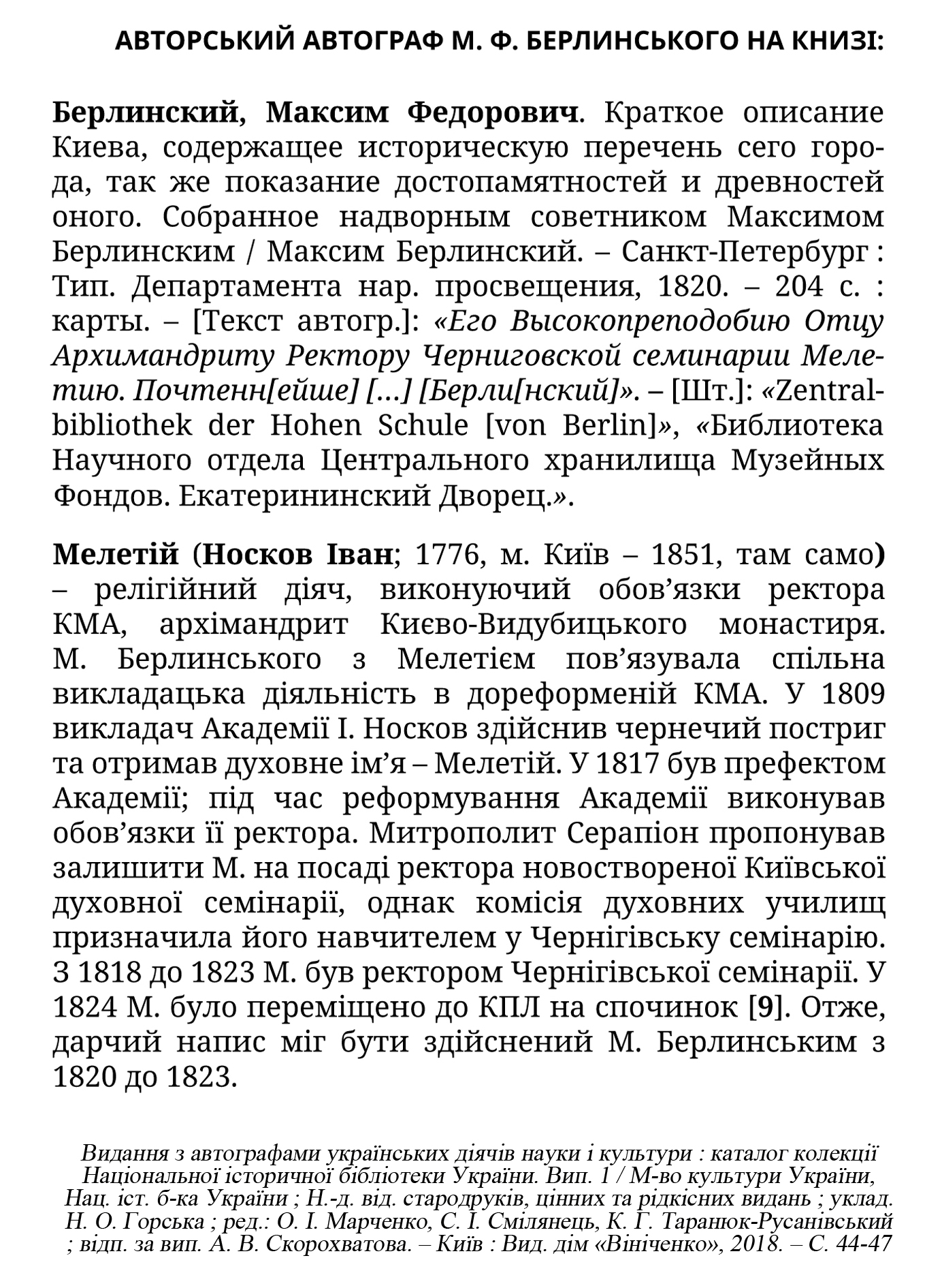 2. Берлинский М. Ф. Краткое описание Киева, содержащее историческую перечень сего города, так же показание достопамятностей и древностей оного. Собранное надворным советником Максимом Берлинским [Електронний документ] / М. Ф. Берлинский. – Санкт-Петербург : Тип. департамента нар. просвещения, 1820. – 204 с. : карта. – Режим доступу : https://nibu.kyiv.ua/elfond/Kratkoe_opisanie_Kieva/Kratkoe_opisanie_Kieva.pdf. – Особливості примірника : [Текст автогр.]: «Его Высокопреподобию Отцу Архимандриту Ректору Черниговской семинарии Мелетию. Почтенн[ейше] […] [Берли[нский]» ; [Шт.]: «Zentralbibliothek der Hohen Schule [von Berlin]», «Библиотека Научного отдела Центрального хранилища Музейных Фондов. Екатерининский Дворец».