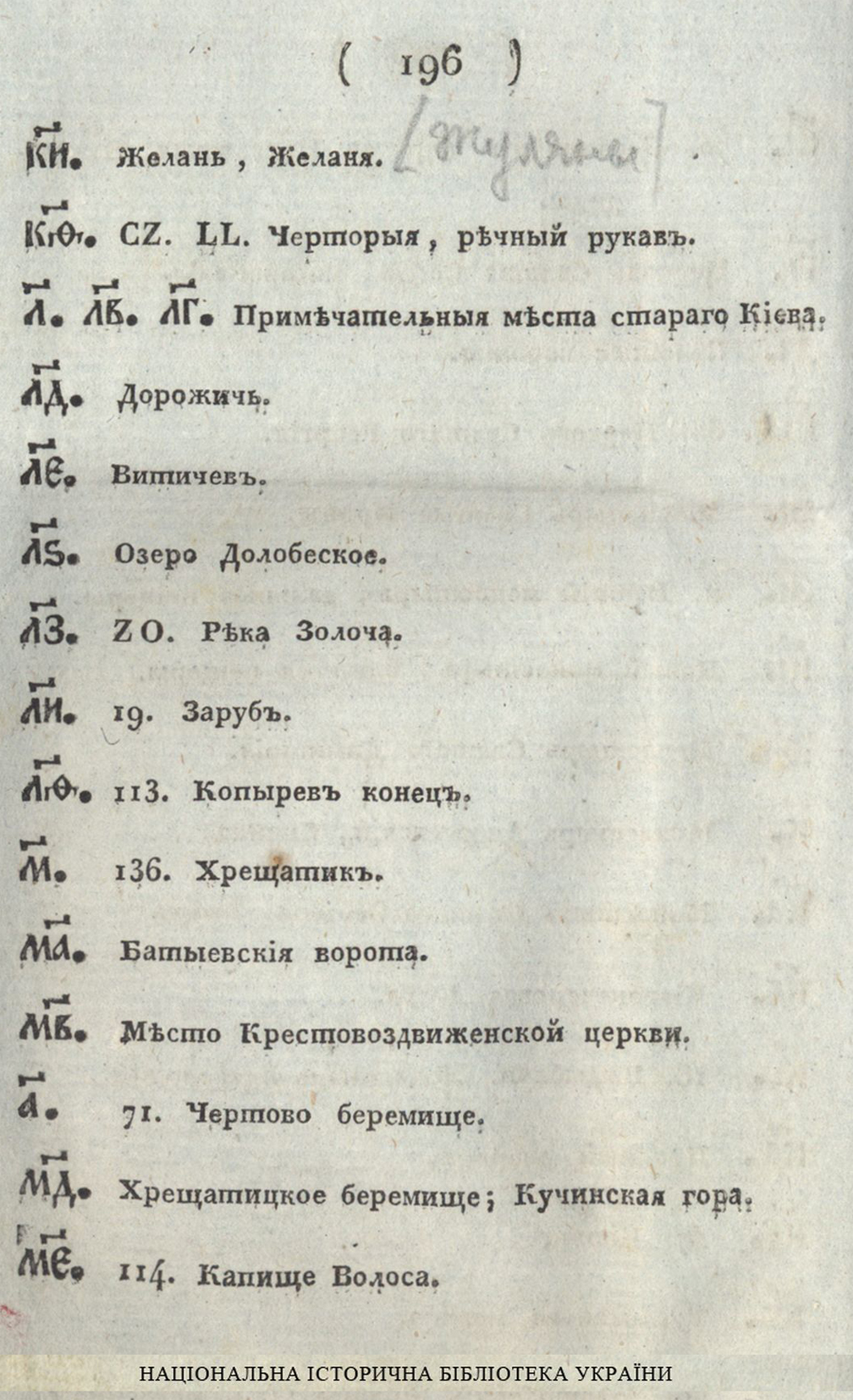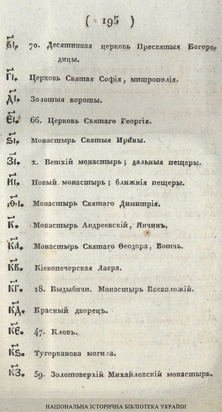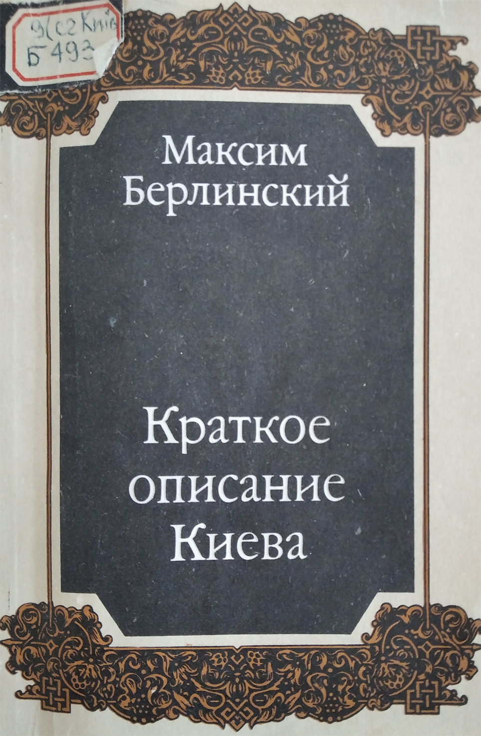 2. Берлинский М. Ф. Краткое описание Киева, содержащее историческую перечень сего города, так же показание достопамятностей и древностей оного. Собранное надворным советником Максимом Берлинским [Електронний документ] / М. Ф. Берлинский. – Санкт-Петербург : Тип. департамента нар. просвещения, 1820. – 204 с. : карта. – Режим доступу : https://nibu.kyiv.ua/elfond/Kratkoe_opisanie_Kieva/Kratkoe_opisanie_Kieva.pdf. – Особливості примірника : [Текст автогр.]: «Его Высокопреподобию Отцу Архимандриту Ректору Черниговской семинарии Мелетию. Почтенн[ейше] […] [Берли[нский]» ; [Шт.]: «Zentralbibliothek der Hohen Schule [von Berlin]», «Библиотека Научного отдела Центрального хранилища Музейных Фондов. Екатерининский Дворец».