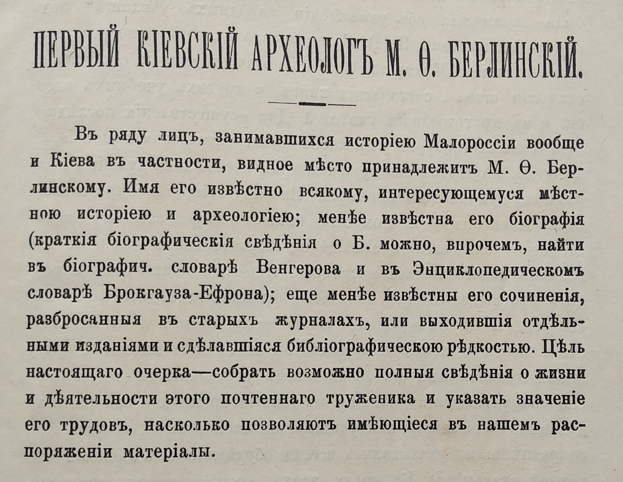 У той час, коли М. Берлинський розпочав студії з історії Києва, українські й, зокрема, київські старожитності майже не були досліджені. Він був першим із науковців, хто ними зацікавився і займався. Джерельна база вченого досить різноманітна – стародавні літописи, хроніки, мемуари, архіви, але особливе місце в ній посідали археологічні матеріали [10, с. 188].