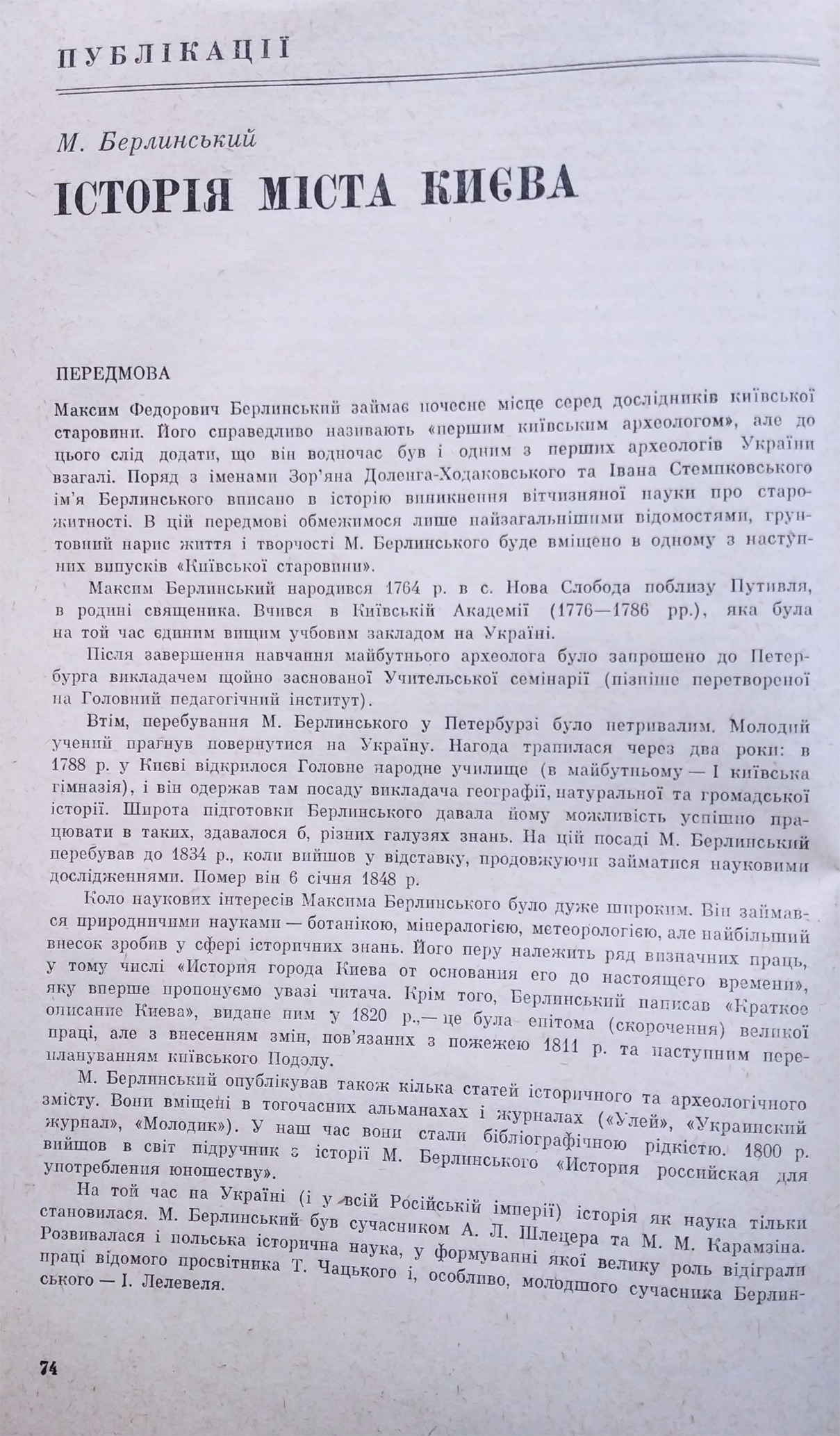 У 1970 році сталася справжня археографічна сенсація. Київська дослідниця Лідія Антонівна Пономаренко знайшла в Ленінградському архіві цензорський примірник праці видатного українського історика і географа Максима Берлинського «История города Киева от основания его до настоящего времени». Фахівці добре знали його книгу «Краткое описание Киева», що вийшла 1820 р., а ось доля головної праці дослідника залишалася невідомою. М. Берлинський, судячи з хронології першої частини «Истории города Киева», доведеної до 1798 р., завершив її близько 1800 р. Напевно, тоді ж, а може й дещо раніше, була написана і друга частина праці. Розповідаючи про знахідки в Києві кісток мамонта, історик уточнив, що вони були зроблені «в прошедшем 797 (1797) году» [4, с. 82].