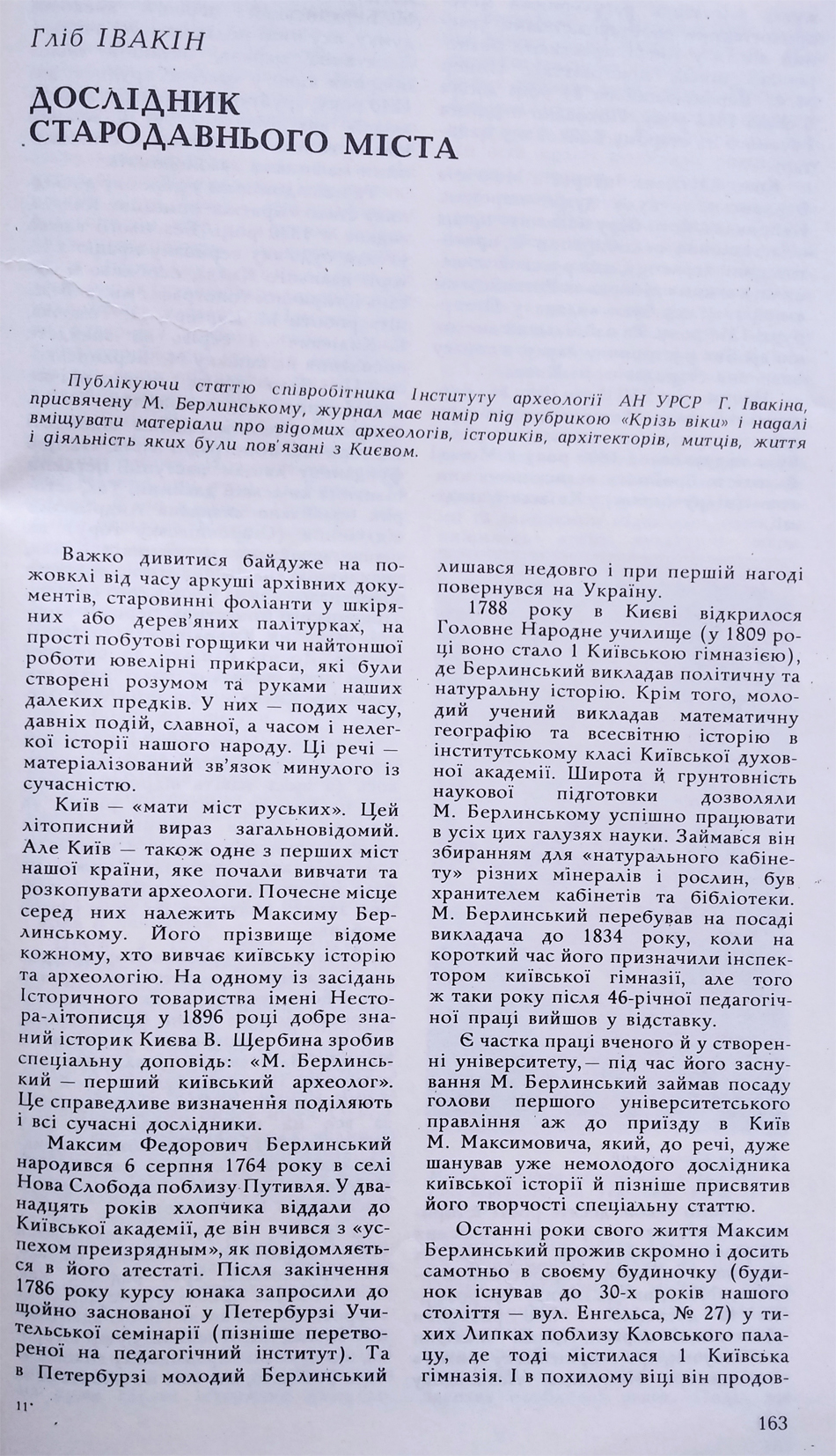 9. Івакін Г. Дослідник стародавнього міста : [присвяч. М. Берлінському] // Київ. – 1984. – № 9. – С. 163–168.