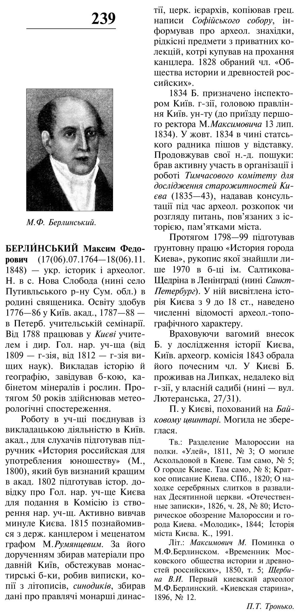 12. Тронько П. Т. Берлинський Максим Федорович / П. Т. Тронько // Енциклопедія історії України : [у 10 т.]. Т. 1: А-В / редкол.: В. А. Смолій (голова) та ін. ; Інститут історії України НАН України. – Київ : Наукова думка, 2003. – С. 239.