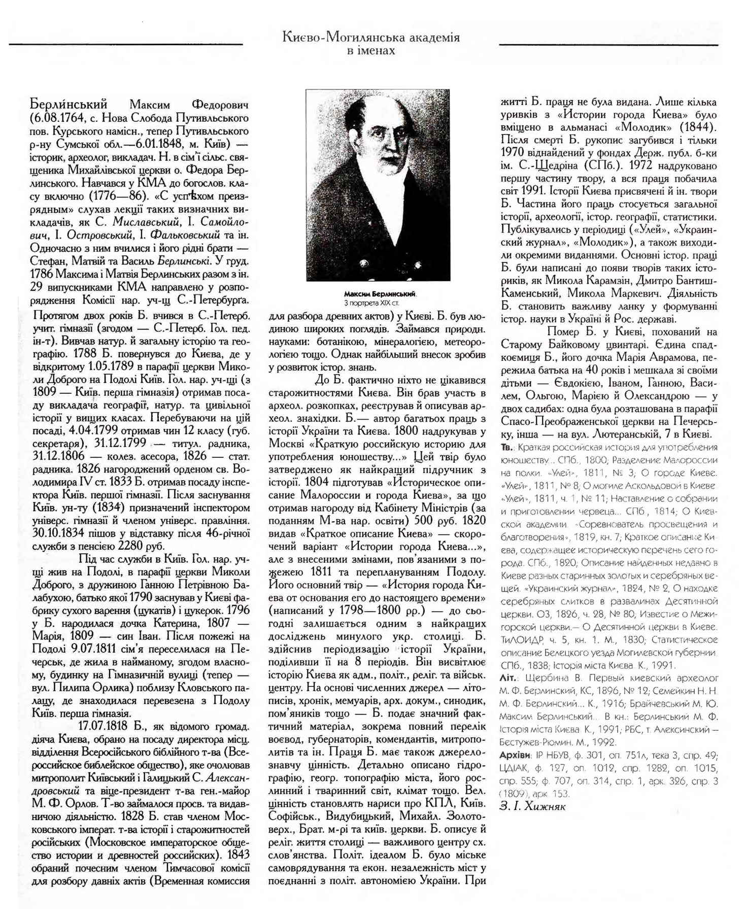 13. Хижняк З. І. Берлинський Максим Федорович / З. І. Хижняк // Києво Могилянська академія в іменах, ХVІІ–ХVІІІ ст. : енциклопедичне видання / ред. В. С. Брюховецький – Київ : КМ Академія, 2001. – С. 66-68.
