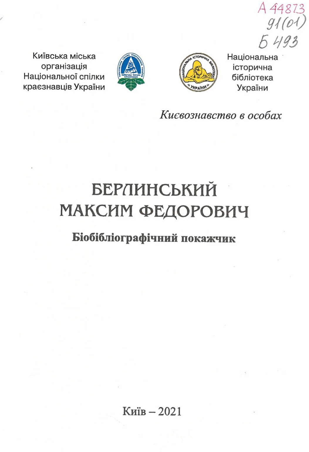7. Берлинський Максим Федорович : біобібліографічний покажчик [Електронний документ] / Київ. міськ. орг. Нац. спілки краєзнавців України, Нац. іст. б-ка України ; наук. ред. О. Реєнт ; упоряд.: О. Гончаров, А. Петровський, З. Мусіна ; ред. Т. Приліпко. – Київ, 2021. – 46 с. – (Києвознавство в особах). – Режим доступу : https://nibu.kyiv.ua/media/uploads/2021/12/16/qvkqem.pdf.