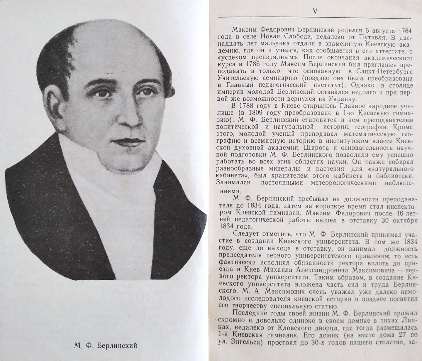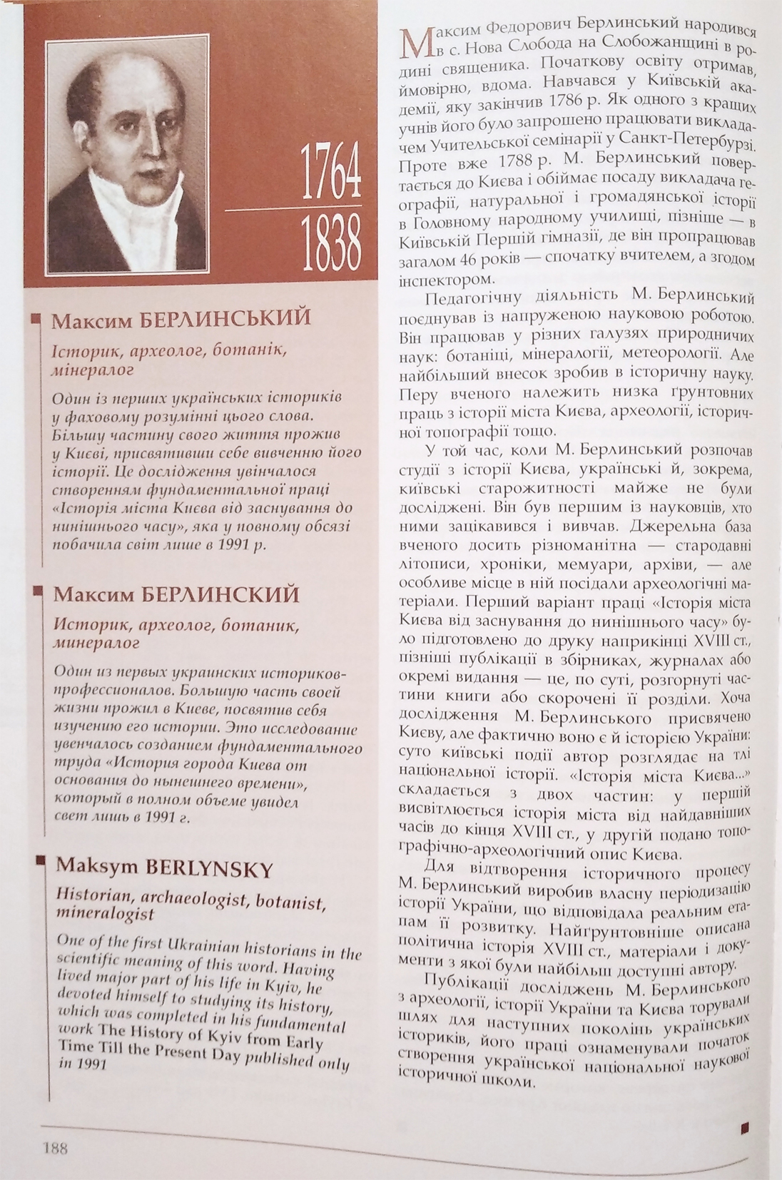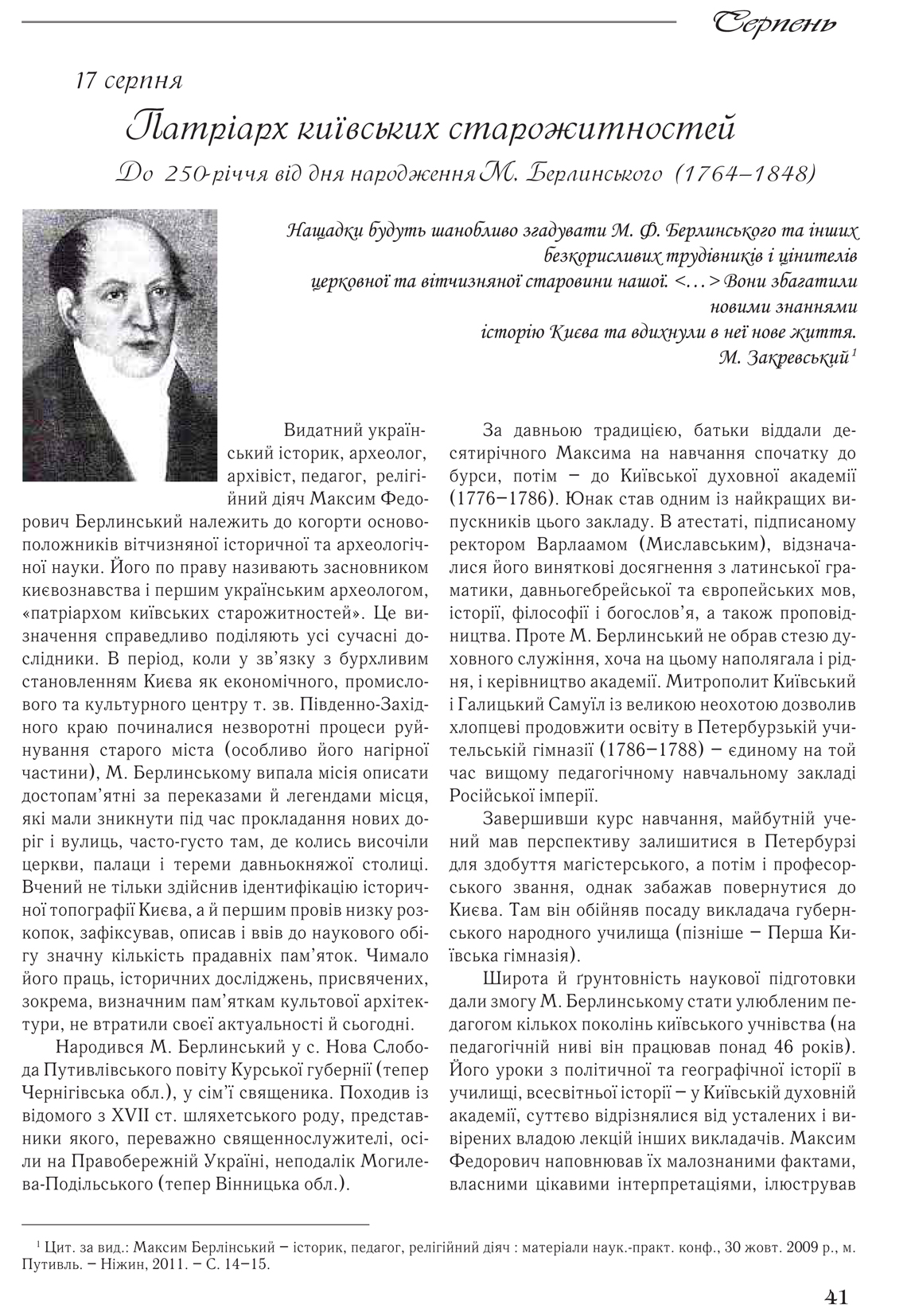Берлинський Максим Федорович (17(06).08.1764, с. Нова Слобода [нині – село у Новослобідській сільській громаді Конотопського району Сумської області] – 18(06).01.1848, м. Київ) – історик, археолог, педагог, архівіст, релігійний діяч, перший києвознавець. Народився в сім’ї сільського священника Михайлівської церкви о. Федора Берлинського. З 1776 по 1786 роки здобував освіту у Київській Академії. Після дворічного навчання в Петербурзькій учительській семінарії (1787-1788) М. Берлинський повернувся до Києва, де у щойно відкритому Київському Головному народному училищі (пізніше – Київська перша гімназія) отримав посаду викладача географії, натуральної та цивільної історії у вищих класах [13, с. 66]. У 1834 році М. Берлинського призначено інспектором Київської першої гімназії, головою правління Київського університету (до приїзду першого ректора М. Максимовича). У жовтні 1834 року в чині статського радника М. Берлинський пішов у відставку. Максим Федорович брав активну участь в організації Тимчасового комітету для дослідження старожитностей Києва (1835-1843), надавав консультації під час археологічних розкопок чи розгляду питань, пов’язаних з історією, пам’ятками міста. Враховуючи вагомий внесок М. Берлинського у дослідження історії Києва, у 1843 році його було обрано почесним членом Київської археографічної комісії для розбору давніх актів [7, с. 13 ; 12, с. 239].Педагогічну діяльність М. Берлинський поєднував з науковою роботою. Він працював у різних галузях природничих наук: ботаніці, мінералогії, метеорології. Але найбільший внесок зробив саме в історичну науку.