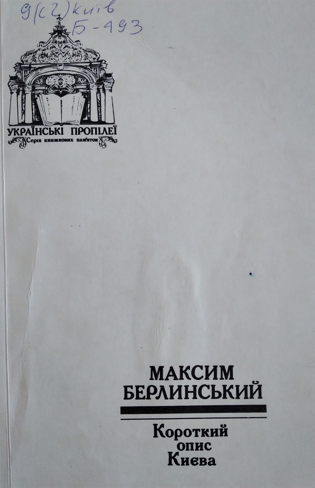6. Берлинський М. Ф. Короткий опис Києва / М. Ф. Берлинський ; редкол.: М. Жулинський (голова) [та ін.]. ; комент. Ю. Олійник. – [Репринтне видання 1820 р.]. – Київ : [б. и.], 1990. – XVIII, 204, IX-XVIII с. : іл. – (Серія книжкових пам’яток «Українські пропілеї»).
