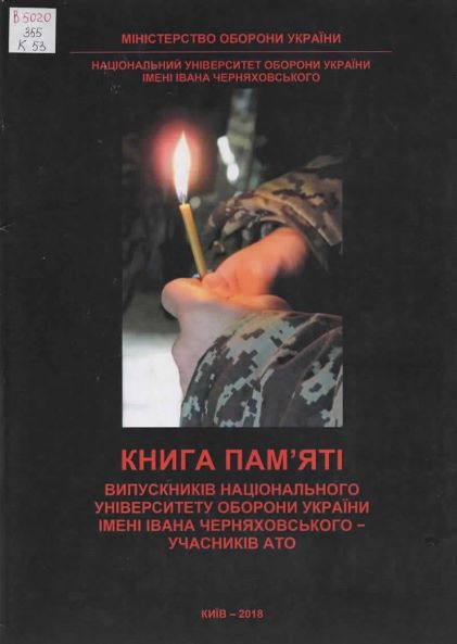 Книга пам’яті випускників Національного університету оборони України імені Івана Черняховського – учасників АТО / Нац. ун-т оборони України ім. І. Черняховського, Н.-д. центр воєн. історії ; уклад. Д. Вєдєнєєв [та ін.]. – Київ, 2018. – 59 с. : фот. Шифр: В5020/355/К53