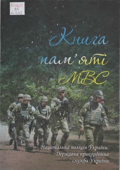 Книга пам’яті МВС. Національна поліція України. Державна прикордонна служба України / А. В. Шевченко, О. В. Родіна, І. І. Лебедь, Г. С. Кобиляцька ; упоряд. О. В. Красовицький ; худож.-оформ. В. М. Карасик. – Харків : Фоліо, 2017. – 368 с. : іл. Шифр: Б9621/35/К532