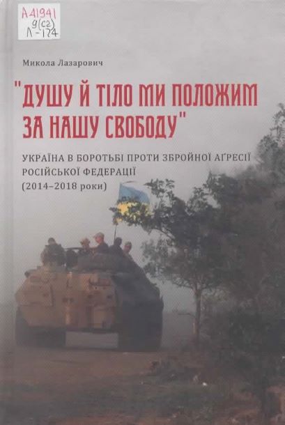 Лазарович М. В. «Душу й тіло ми положим за нашу свободу»: Україна в боротьбі проти збройної аґресії Російської Федерації (2014–2018 роки) / М. В. Лазарович. – Ічня : Формат, 2018. – 337 с. : іл., фот. Шифр: А41941/9(с2)Л174