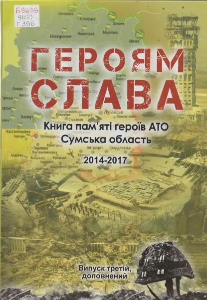 Героям Слава. Книга пам’яті героїв АТО. Сумська область : 2014-2017 / Сумська облдержадмін, Сумська облрада. – 3-є вид., допов. – Суми : Еллада, 2017. – 144 с. : фот. Шифр: Б9639/9(с2)/Г396