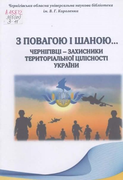 З повагою і шаною… Чернігівці – захисники територіальної цілісності України : рек. бібліогр. покажч. / Чернігівська обл. універс. наук. б-ка ім. В. Г. Короленка ; [уклад.: Л. В. Студьонова, І. Я. Каганова ; відп. за вип. І. М. Аліференко]. – Чернігів, 2021. – 73 с. Шифр: А45872/355(01)/З11