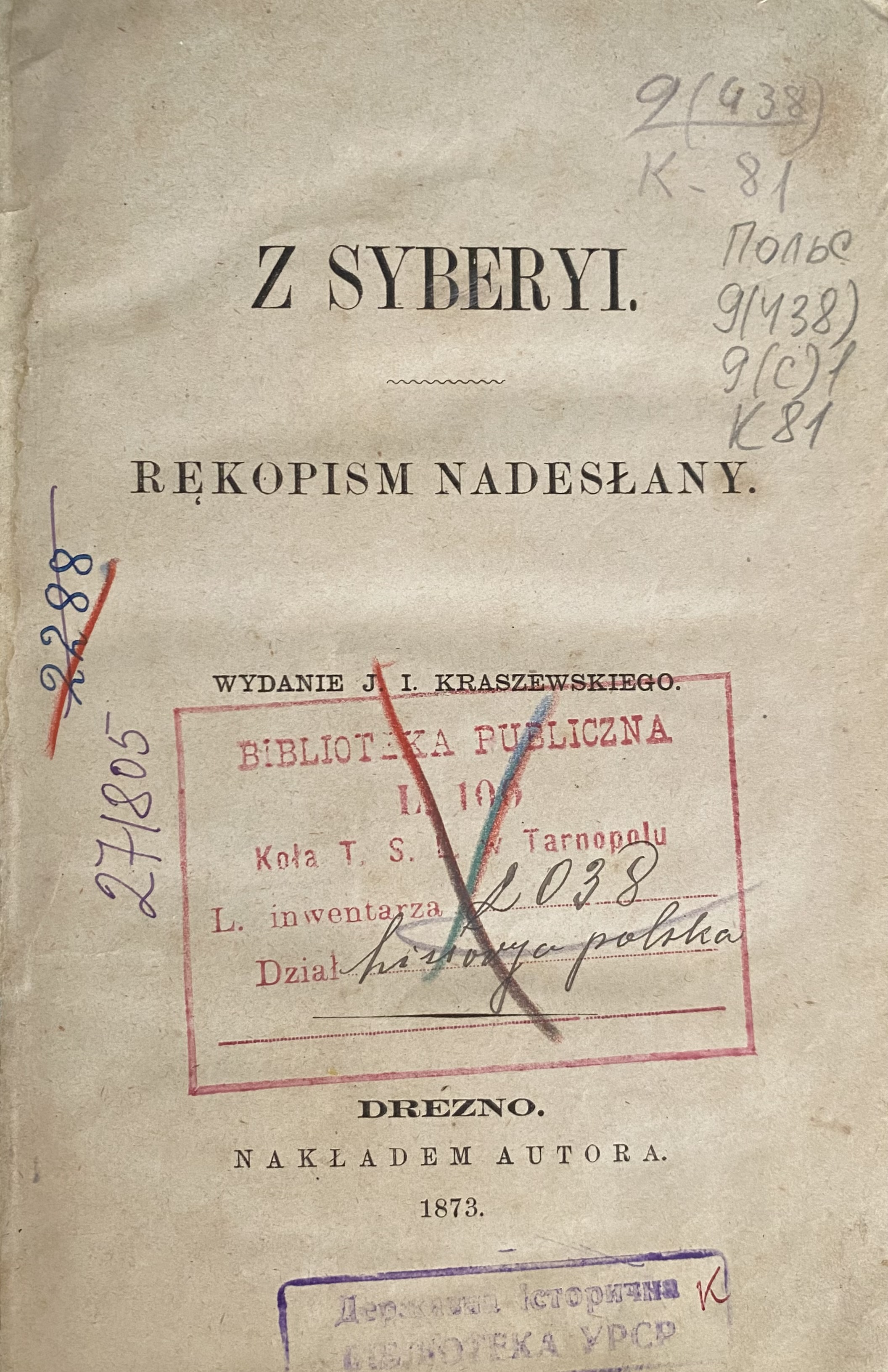 Kraszewski, J. I. Z Syberyi. Rekopism nadeslany [Текст] / J. I. Kraszewski. - Drezno : Nakladem Autora, 1873. - 267 с. - Польс.