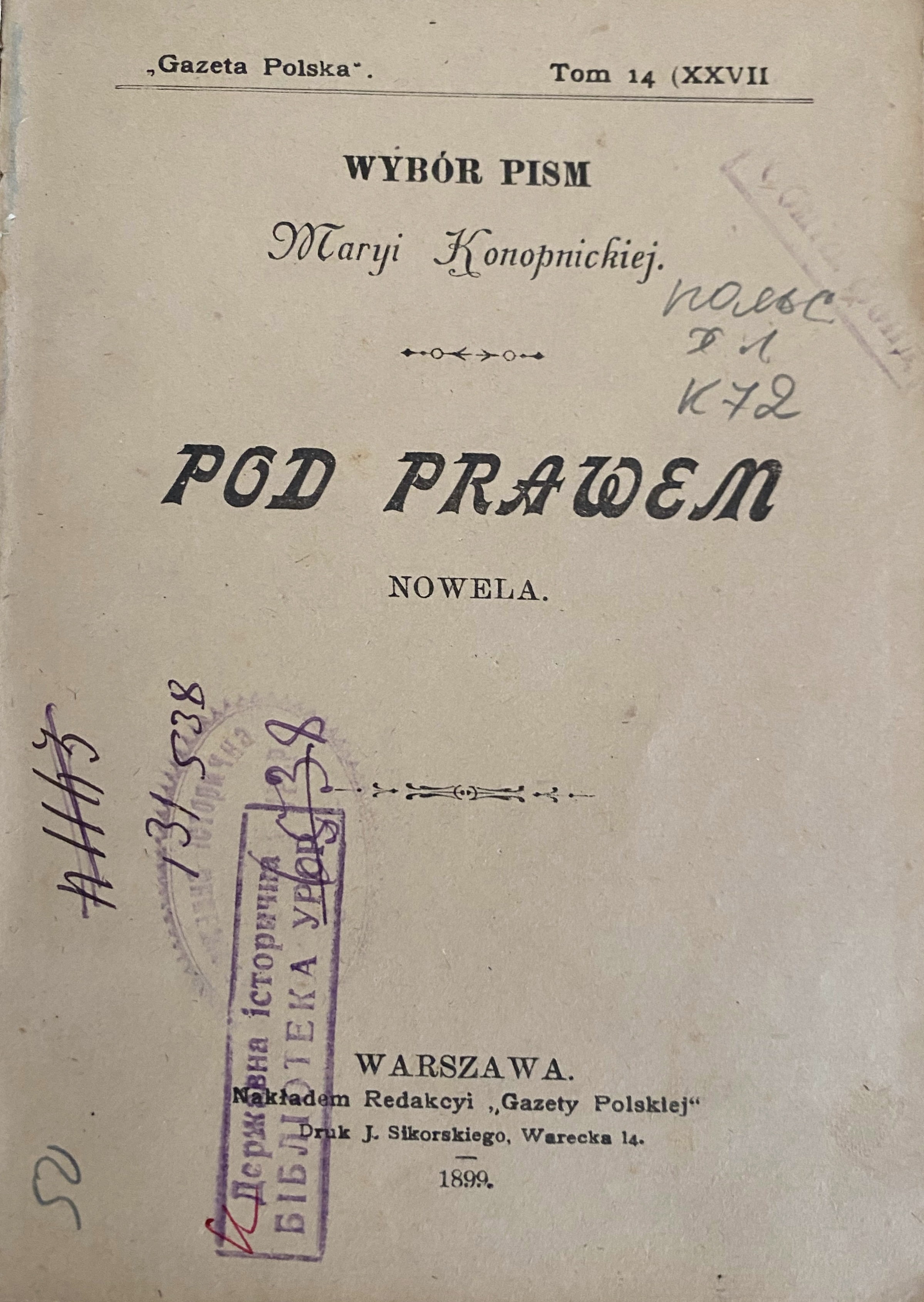 Konopnicka, Maria. Pod prawem. Nowela [Текст] / M. Konopnicka. - Warszawa : [s. n.], 1899. - Польс.