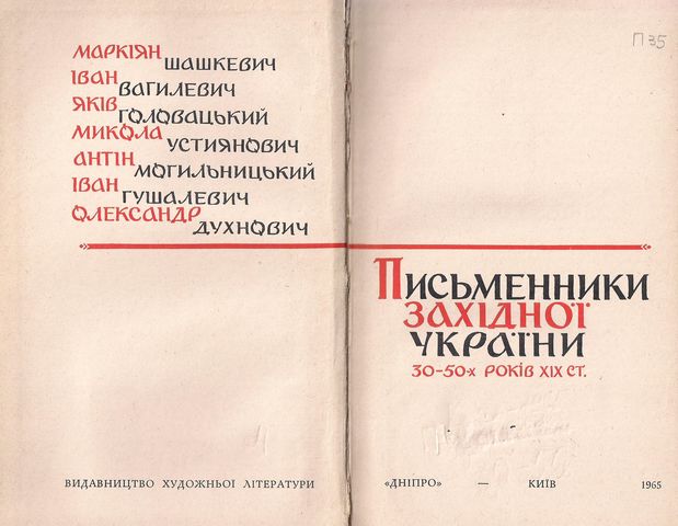 Письменники Західної України 30–50-х років XIX ст. Маркіян Шашкевич, Іван Вагилевич, Яків Головацький, Микола Устинович, Антін Могільницький, Іван Гушалевич, Олександр Духнович : Збірник. – Київ : Дніпро, 1965. – 652 с. : портр., факс., 3 л. іл.
