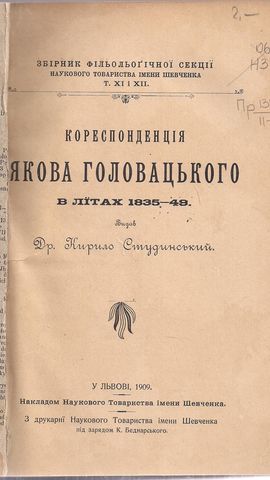 Кореспонденція Якова Головацького в літах 1835 - 49. Видав Др. Кирило Студинський. – Львів: Друкарня Наукового Товариства ім. Шевченка, 1909. – 463 с.