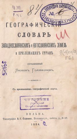 Головацкий Я.Ф. Географический словарь западнославянских земель и прилежащих стран / Я. Ф. Головацкий. – Вильна : Тип. Сыркина, 1884. – XXXII, 371 с. – [Текст рос.]