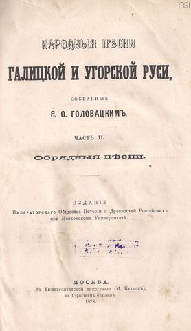 Головацкий Я.Ф. Народные песни Галицкой и Угорской Руси.Ч. 2. Обрядовые песни / Я. Ф. Головацкий. – Москва : Университетская тип., 1878. – 841, ІІ с. : грав. – [Teкст рос.]