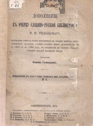 Головацкий Я. Дополнение к очерку славянорусской библиографии В. М. Ундольского, содержащее кн. и ст. пропущенные в первом вып. хоронолог. указ. славяно-русских книг церковной печати с 1491-го по 1864 год, в особенности же перечень галицко-русских изд. церковной печати : Прил. к XXIV-му тому записок имп. акад. наук № 3 / Я. Головацкий. – СПб. : Император. АН, 1874. – 95 с. – [Текст рос.]