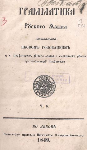 Головацкий Я.Ф. Грамматика русского языка / Я. Ф. Головацкий. – Львов : Ин-т Ставропигийский, 1949. – 96 с. – [Текст рос.]