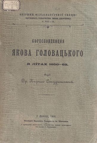 Кореспонденція Якова Головацького в літах 1850 – 62. Видав Др. Кирило Студинський. – Львів: Друкарня Наукового Товариства ім. Шевченка, 1905. – 592 с.