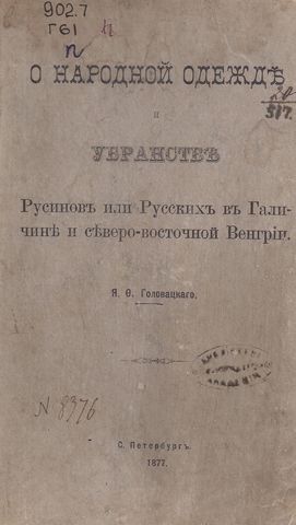 Головацкий Я.Ф. О народной одежде и убранстве Русинов или Русских в Галичине и северо-восточной Венгрии / Я. Ф. Головацкий. – Санкт-Петербург : Тип. Киршбаума, 1877. – 85 с. : 4 л. ил. - [Tекст рос.]