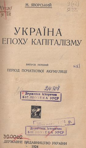 Яворський М. Україна в епоху капіталізму. Вип. 1. Період початкової акумуляції / М. Яворський. – Харків : Держ. вид-во України, 1924. – 371 с.