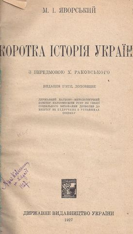 Яворський М.І. Коротка історія України / М. І. Яворський. - 5-е вид., допов. – Харків : Держ. вид-во України, 1927. – 150 с.