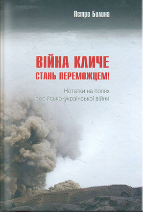 Війна кличе. Стань переможцем! : нотатки на полях російсько-української війни Ч. 1 / Петро Билина. – Київ : Український пріоритет, 2017. – 165, [2] с. Книга нотаток бійця добровольчого батальйону особливого призначення «Золоті ворота» Петра Билини - документ нашого часу, що невдовзі, безсумнівно, стане одним із джерел для дослідників історії російсько-української війни, що триває нині. Спокійне споглядання воєнних подій, свідком і учасником яких у 2014-2015 роках випало стати авторові цих нотаток, це тло для проникливих роздумів над долею нашої країни, подіями її минулого та сьогодення.