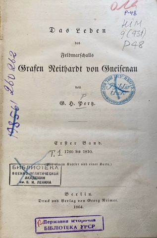Pertz, Georg Heinrich. Das Leben des Feldmarschalls Grafen Neithardt von Gneisenau. Bd. 1: 1760-1810. Berlin, 1864. XX, 696 S. (Шифр 9(431)/P48-302905)