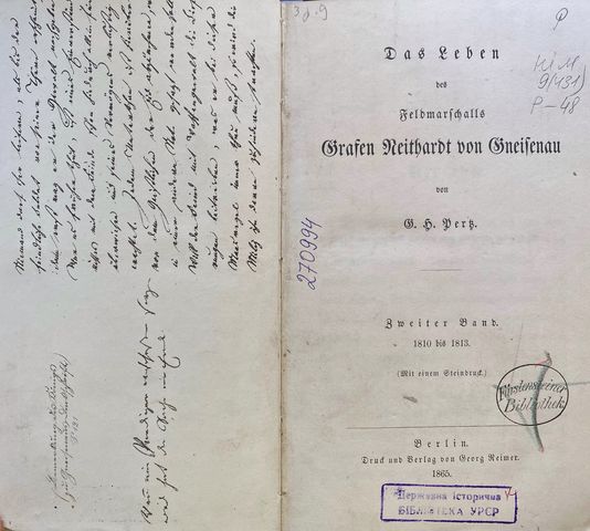 Pertz, Georg Heinrich. Das Leben des Feldmarschalls Grafen Neithardt von Gneisenau. Bd. 2: 1810-1813. Berlin, 1865. 725 S. (Шифр 9(431)/P48-740550)