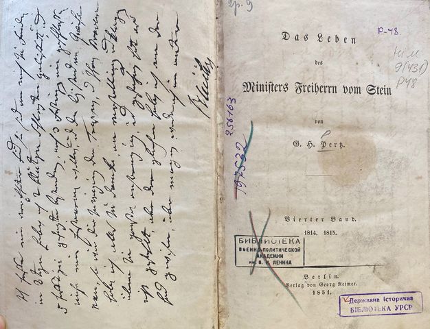 Pertz, Georg Heinrich. Das Leben des Ministers Freiherrn vom Stein. Bd. 6, Teil 2: 1829-1831. Berlin: G. Reimer, 1855. 641-1238, 288 S. (Шифр 9(431)/P48-486613)