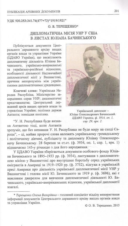 Терещенко, О. В. Дипломатична місія УНР у США в листах Юліана Бачинського / О. В. Терещенко // Архіви України. – 2015. – № 4. – С. 201 – 230.
