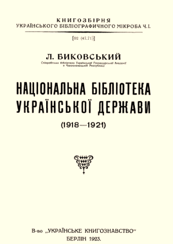Биковський Лев. Національна бібліотека української держави (1918–1921) / Л. Биковський. – Берлін : Вид-во українське книгознавство, 1923. – 38 с. – (Книгозбірня українського бібліографічного мікроба ; Ч. 1).