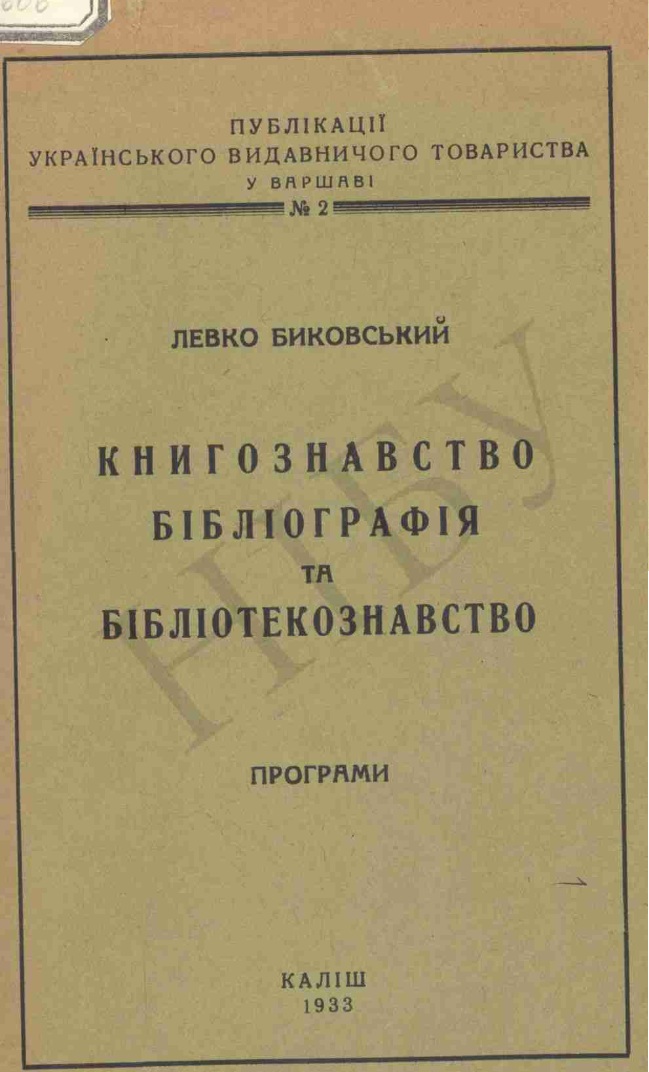 Биковський Левко. Книгознавство. Бібліографія та бібліотекознавство: програми / Л. Биковський. – Каліш, 1933. – 32 с. – (Публікації українського видавничого товариства у Варшаві ; № 2).