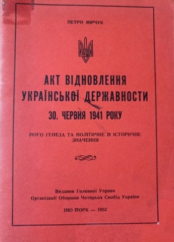 Мірчук П. Акт відновлення української державности. 30 червня 1941 року (його ґенеза та політичне й історичне значення) / П. Мірчук. – Нью-Йорк : Вид. Голов Управи Орг. Оборони Чотирьох Свобід України, 1952. – 52 с.