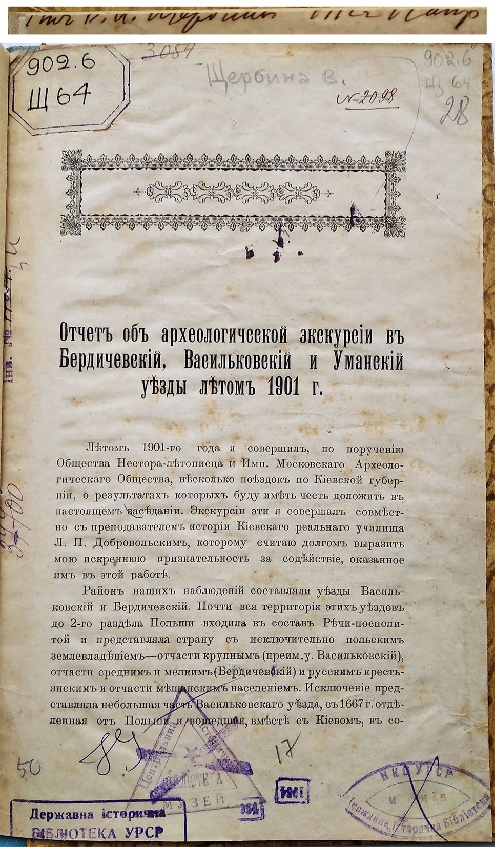 17. Щербина В. Отчет об археологической экскурсии в Бердыческий, Васильковский и Уманский уезды летом 1901 г. / В. И. Щербина. – [Киев] : [б. и.], 1901. – 16 с. Оттиск из: Чтения в историческом обществе Нестора Летописца. Кн. 15. - Киев : Унив. Тип., 1901. Особливості примірника : [Текст автогр. на 16-й с. (обріз.)]: «От В. И. Щербины. [...]»; [Шт.]: «Центральний Історичний музей. Бібліотека».